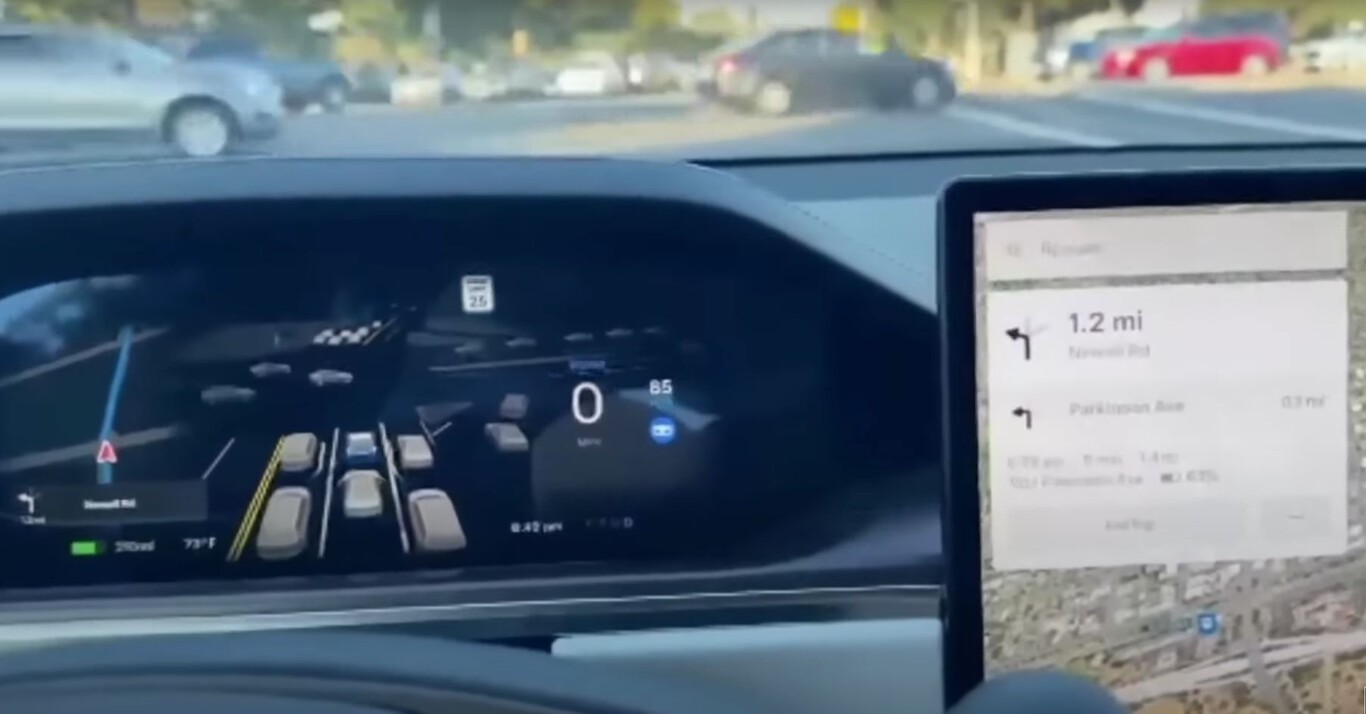 Musk comienza su viaje con el Tesla Autopilot FSD V12 desde la sede de ingeniería de Tesla en Palo Alto, California, a bordo de su Model S con volante yoke. Activa el modo Autopilot y deja que el vehículo conduzca por sí solo hasta un destino que elige en la pantalla.