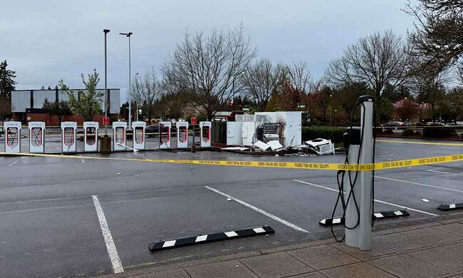 Según informa el Departamento de Policía de Lacey varias personas alertaron sobre las 1:34 am de un "fuerte ruido" que podría ser una explosión cerca de unos grandes almacenes Target en Sleater Kinney RD, en Lacey (Washington). En su aparcamiento se ubica una estación de Supercagardores de Tesla. Varias patrullas acudieron a la zona, y se toparon con varios elementos de la instalación destrozada.