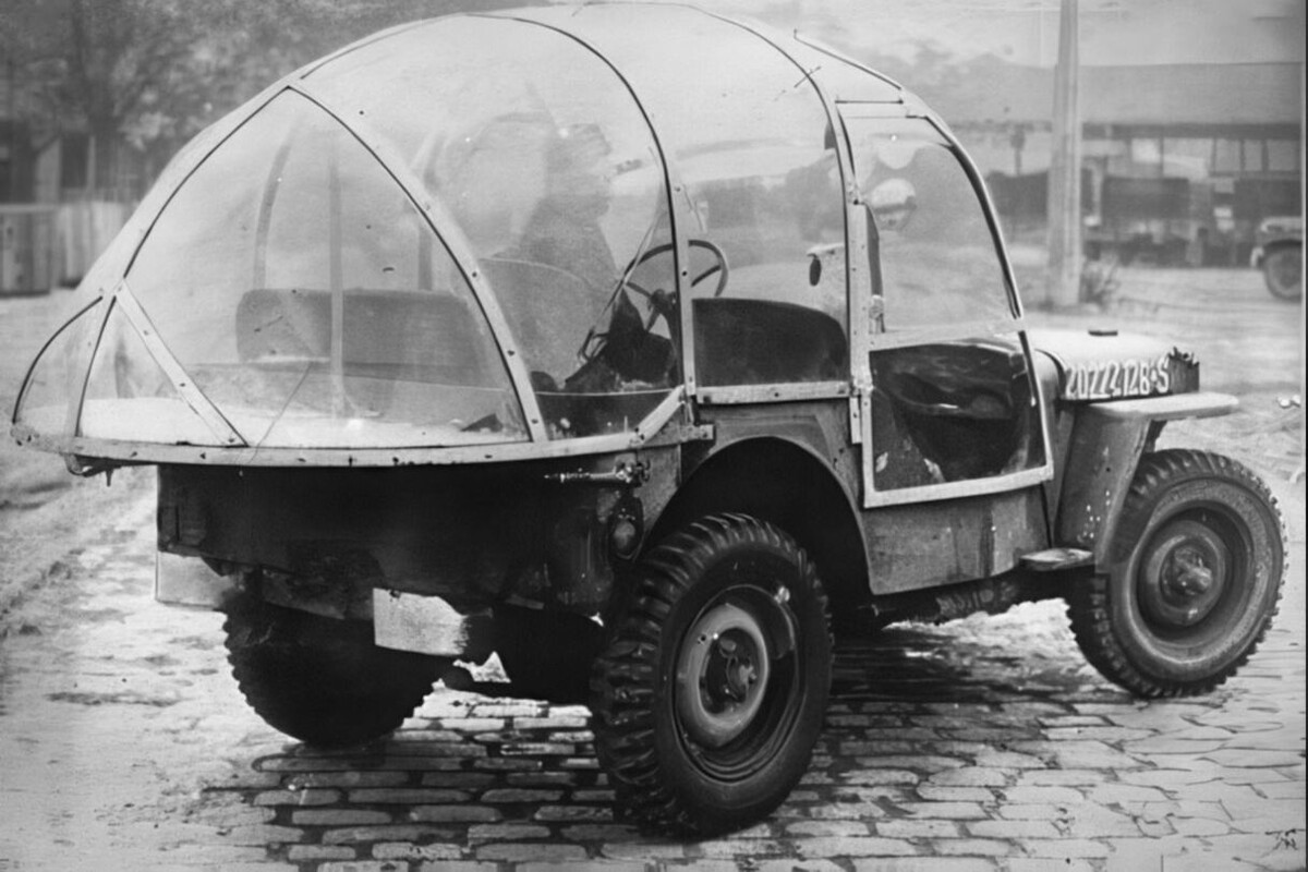 En ese contexto nació uno de los vehículos más insólitos del conflicto: un Jeep Willys MB del Ejército de EEUU equipado con una cabina de plástico en forma de lágrima, completamente cerrada y dotada de limpiaparabrisas, foco frontal y sistema de desempañado. No fue ni mucho menos un modelo oficial: fue una solución improvisada en pleno frente.