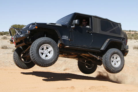 El que véis volando en la primera imagen es el Jeep Wrangler JKL, un 4x4 puro y duro al que le han equipado nada menos que el motor HEMI V8 6.1, teniendo que alargar su batalla para evitar que el tren delantero despegue del suelo en un acelerón en subida. Se le ha equipado con neumáticos de 37 pulgadas y un kit de elevación de 4 pulgadas.