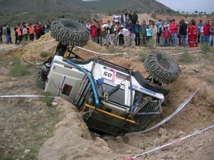El sábado y el domingo se disputó en Mazarrón la primera prueba puntuable del Campeonato de España de 4×4 Extremo y como se puede ver en la foto, no fue nada fácil para los participantes. Aunque parezca increíble, el piloto aún está dentro del coche y el copiloto está intentando poner otra vez el coche sobre sus cuatro ruedas. Todo un gesto de competitividad y pocas ganas de tirar la toalla. Un aplauso para ese equipo que estuvo ahí dando espectáculo.
