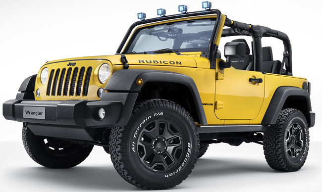 La carrocería, pintada en color amarillo Baja, incorpora diversos accesorios Mopar, elementos en contraste de color negro como la parrilla frontal o la tapa del depósito de combustible, techo desmontable, neumáticos todoterreno Goodrich (y rueda de repuesto en la zaga), protecciones de plástico negro, iluminación LED auxiliar y gráficos específicos, como distintivos Rubicon o la estrella del ejército estadounidense en el capó y en la trasera.