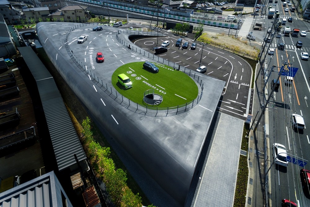 Creado para Toyota Shin-Osaka Sale Holdings y diseñado por el estudio de arquitectura Takenaka Corporation con Mitamura Satoshi a la cabeza, las instalaciones se fusionan con el entorno dando lugar a una sucesión de espacios que juegan al trampantojo entre el propósito comercial y la sensación de estar haciendo cualquier otra cosa aparte de comprar un coche.