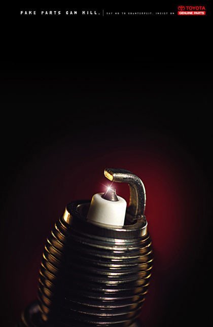 Así a primera vista, es difícil de entender el mensaje de estos anuncios de Toyota que promocionan el uso de recambios originales. El mensaje es claro, las piezas falsas pueden matar.