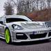 En el apartado exterior es fácil diferenciar a un Panamera normal de la versión retocada por TechArt. El kit incluye un frontal más ancho y agresivo, capó de fibra de carbono, pasos de rueda ensanchados, taloneras, alerón trasero integrado y un paragolpes con un marcado difusor. Las llantas son ahora unas Formula V de 22 pulgadas rematadas en un color verde fluorescente a juego con otros detalles de la carrocería.