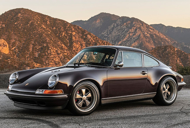 Toda la carrocería de este restomod ha sido concebida en fibra de carbono y va pintada en un precioso morado berenjena bautizado por Singer como Aubergine Light Pearl. Y aunque mantiene las mismas líneas que el modelo clásico, incorpora algunos detalles santo y seña de los modelos Singer, como la boca de carburante colocada sobre el capó delantero.