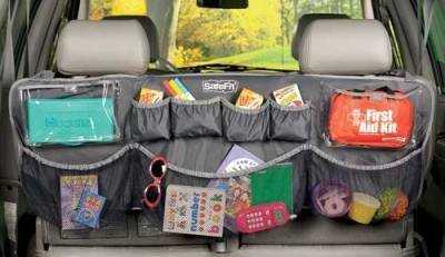 En Bebés y más presentan este organizador de juguetes. Cuesta 15 dólares y permite acumular todo lo que se necesita para mantener entretenido al niño durante viajes largos. No niego que sea útil, pero prefiero ir a pata antes que poner eso en mi coche.