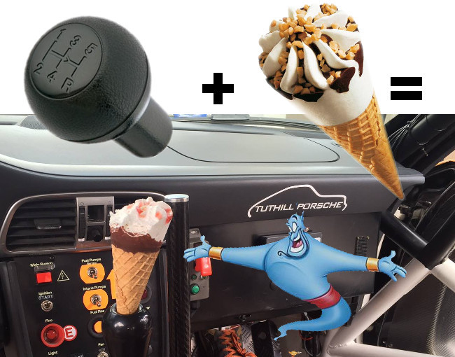 Bien, pues François Delecour, del equipo Tuthill Porsche, ha dado con la solución. Por lo visto, el veterano piloto llevó el Porsche 911 R-GT del equipo tan bien en el Rally de Alemania que decidió darse un autohomenaje helado. Y no tuvo otra ocurrencia que encajar el cucurucho en el pomo, de manera que quizá le debamos a Delecour un nuevo invento, para satisfacción de los amantes de los helados que conducen Porsches. Vale, es una guarrada, pero es una guarrada refrescante y nutritiva.