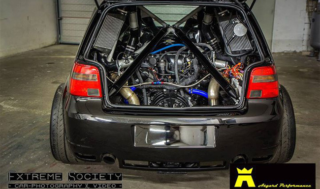 Pues esto es precisamente lo que propone el preparador alemán Asgard Performance, que ni corto ni perezoso, ha sustituido el motor V6 atmosférico del VW Golf R32 (IV) por el 5.2 litros V10 de Lamborghini, equipado con dos turbos, aunque éste ya no ocupa el vano motor, puesto que está ubicado detrás, tras los asientos delanteros.