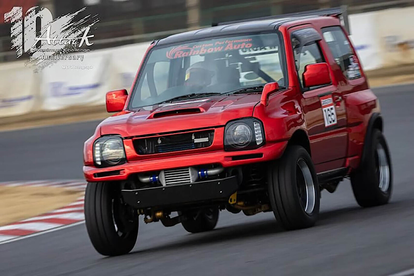 En la celebración del 10º aniversario de Attack Tsukuba, Dino Dalle Carbonare, de Speedhunters, descubrió unos cuantos de estos Jimny. Al parecer, la mayoría son obra de un taller cercano al circuito de Tsukuba y vecino de RWB y sus Porsches ensanchados llamado Rainbow Auto.
