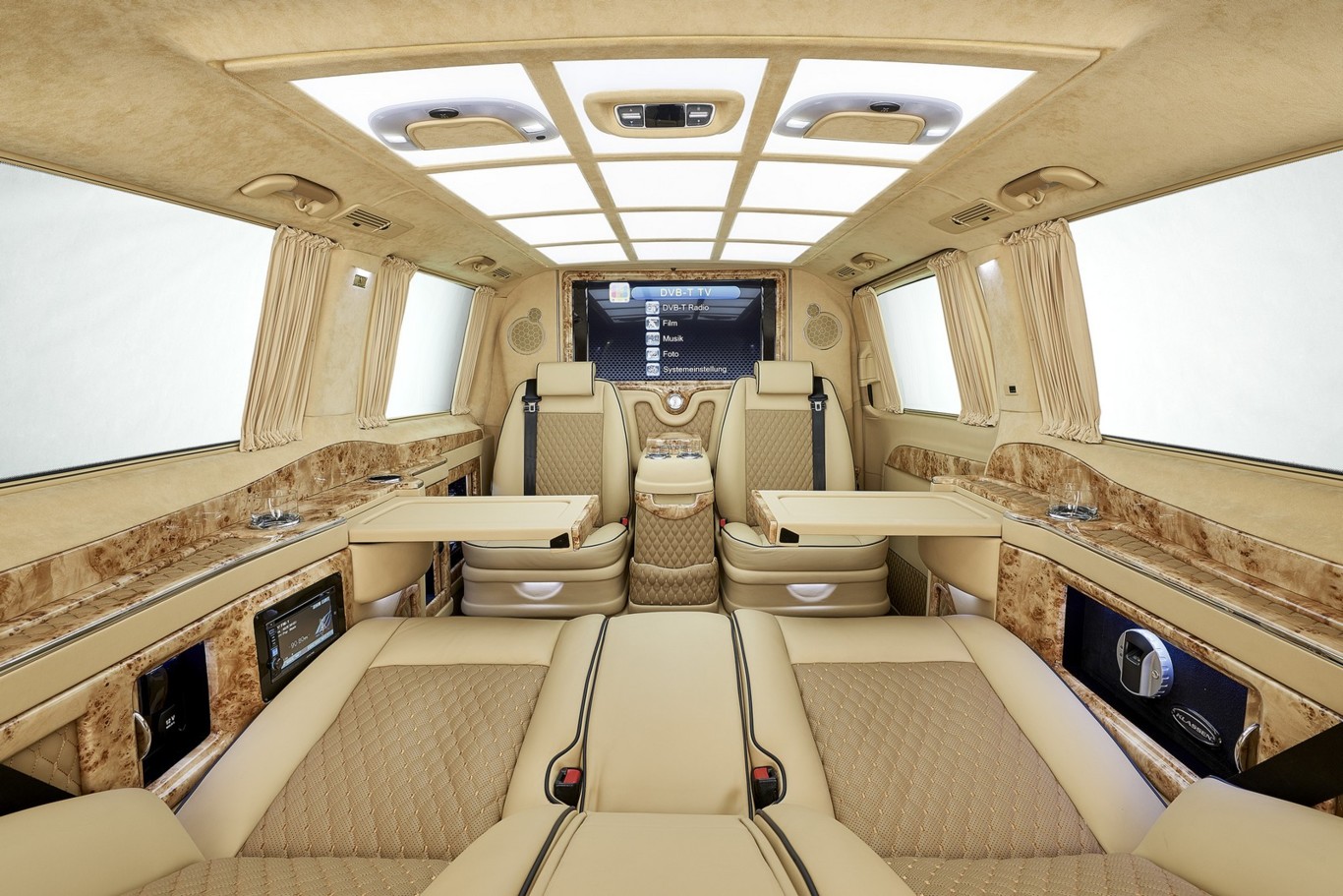 Con ayuda del especialista Klassen, el preparador propone asientos de cuero de "primera clase", inserciones de madera, tapizados en alcántara (en techo y gran parte del habitáculo), separación entre la zona de pasajeros y el conductor, pantalla plana, sistema de sonido Alpine, minibar, cortinillas de privacidad, una caja fuerte biométrica (funciona con huella dactilar), mesitas retráctiles o tomas de corriente para la carga de dispositivos. No te pierdas la galería de imágenes.