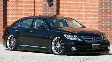 Un Lexus LS600h con la suspensión rebajada al máximo, llantas enormes con neumáticos de perfil bajo y aparentemente inclinadas para darle una estética de coche más ancho.