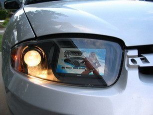 Primero fueron las llantas giratorias, luego los reproductores de DVD, el car-audio… el tuning y los gadgets parecen ir de la mano. La última moda es integrar una pequeña pantalla LCD en las ópticas delanteras del coche. Y ahora no tan pequeñas, la de la fotografía son 7 pulgadas.