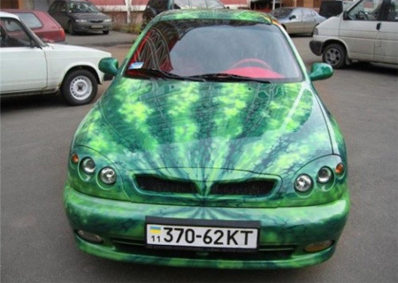 De todas las decoraciones extrañas que hemos visto por aquí, creo que esta es la primera que sale directamente desde una frutería. Ya hay que tener amor por las sandías para pintar tu coche como tal.
