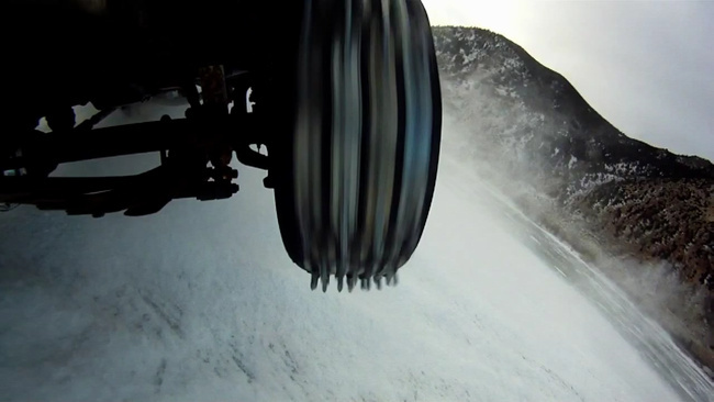 Esto que vamos a ver se grabó el fin de semana pasado en Georgetown Lake, en Colorado, donde a estas alturas del año ya van por allí los pingüinos con gabardina y el lago se transforma en una superficie helada sobre la cual se montan circuitos de competición y exhibición de trastos sobre ruedas que dan que pensar. Y el que vemos a continuación es uno de ellos: