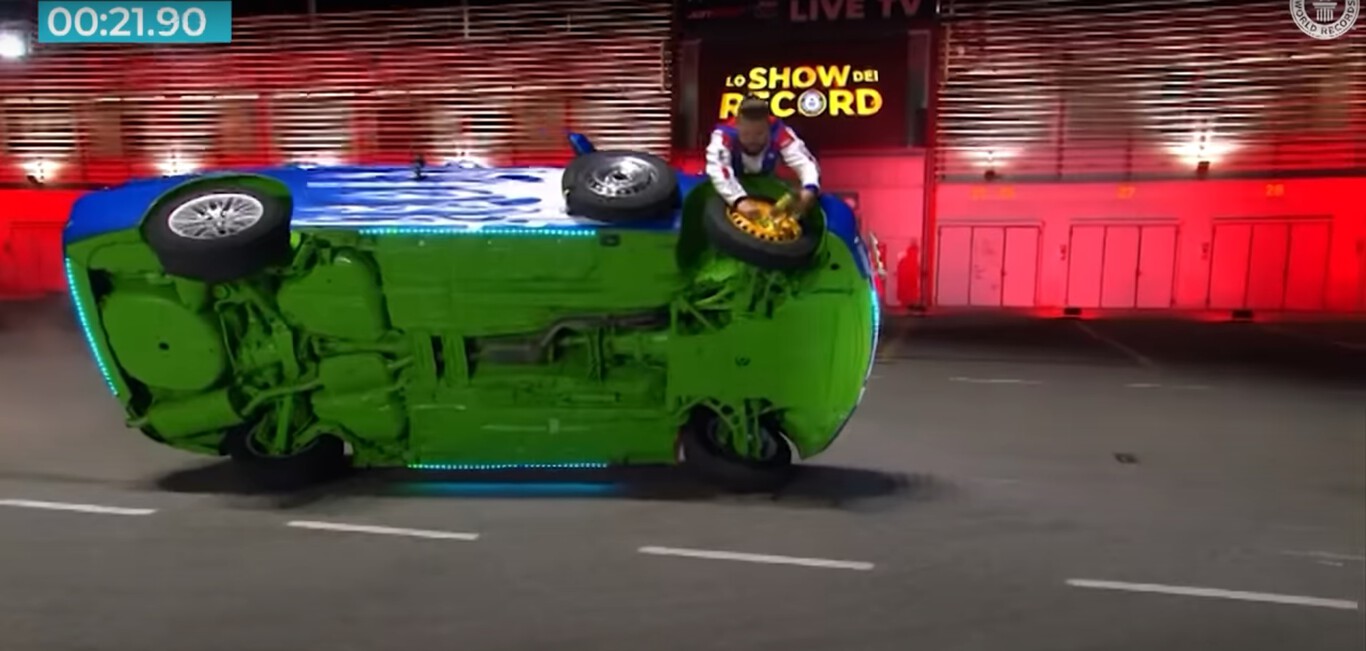 El vídeo oficial está en el canal de YouTube de Guinness World Records. En él vemos cómo ambos artistas entran con un coche al recinto cerrado (la seguridad lo primero) y comienza a correr el cronómetro. Lo primero es levantar la rueda en cuestión pero claro, al no poder parar el coche, esto sólo es posible poniéndolo casi en vertical.