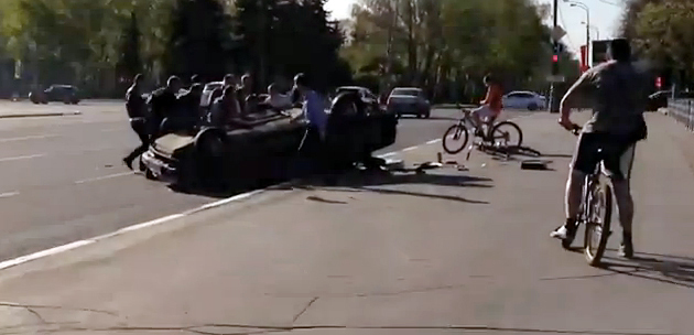 Justo en el momento en el que el Audi R8 atraviesa el cruce derrapando mientras su amigo le graba en vídeo, el pobre conductor del Lada Samara llega al mismo tiempo a la intersección, viéndose golpeado por el supedeportivo y volcando tras el impacto.