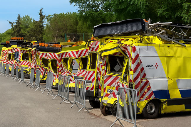 Quienes hayan decidido viajar por carretera en Francia este verano, se están encontrando con que en los peajes y áreas de servicio de las autopistas, hay decenas de furgonetas amarillas totalmente destrozadas, como si acabaran de salir de un accidente. Y lamentablemente no son atrezzo: son vehículos reales de los equipos de carretera que fueron arrollados mientras trabajaban.