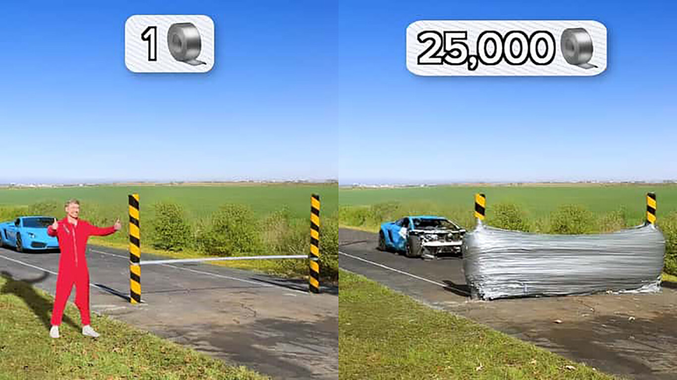 En el vídeo de unos 14 segundos publicado en las redes sociales con el título ‘¿Cuánta cinta adhesiva se necesita para detener un Lamborghini?’, el joven de 26 años ha conseguido que alguien conduzca un Lamborghini Gallardo contra una barrera de cinta americana, aumentando cada vez el número de rollos utilizados para crear esa barrera. Por otra parte, todo apunta a que Mr.Beast no estuvo presente cuando se realizó el vídeo (basta con ver la diferencia en longitud de su sombra con respecto a la del coche o la de los postes).