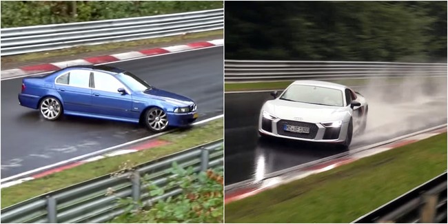 Hoy traemos dos ejemplos claros de que si el Infierno Verde ya es complicado en condiciones normales, con el asfalto mojado se convierte en una bestia impredecible capaz de poner en aprietos al más experimentado de los conductores. Un Audi R8 V10 Plus y un BMW M5 E39 son las víctimas, pero con una sutil diferencia: uno tiene manos y el otro no.