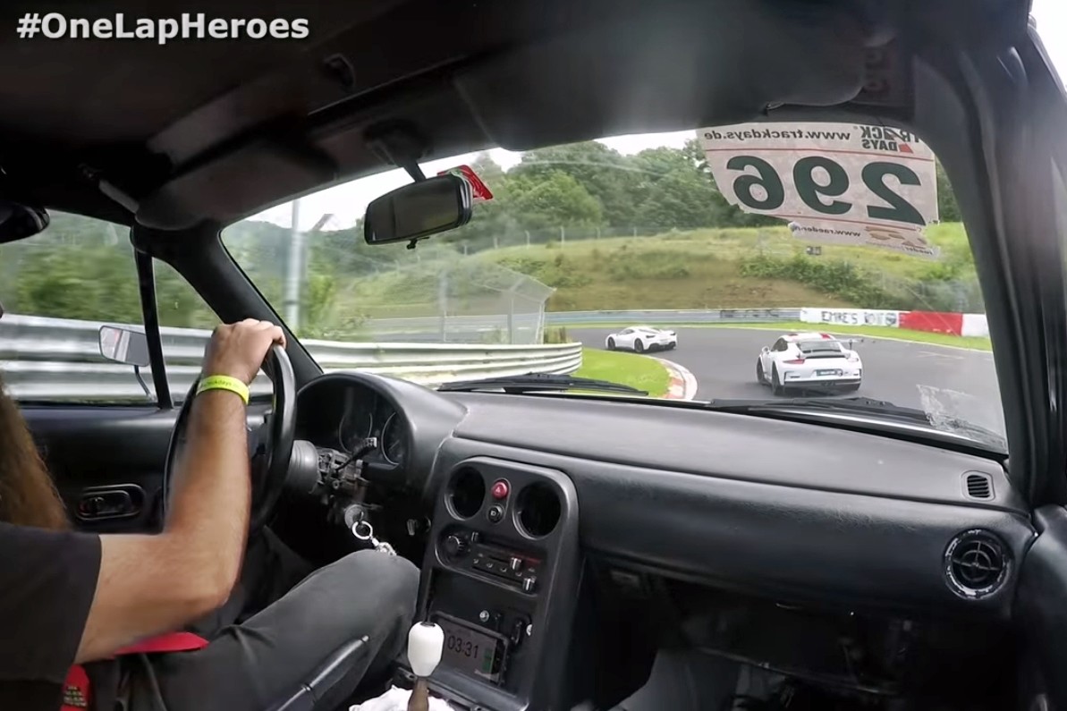 No es una carrera, ni ninguna competición. Simplemente es una jornada de tandas libres en Nürburgring y este hombre barbudo se dispone a disfrutar de su ligero Mazda MX-5 modificado dentro del Infierno Verde. Se dispone a salir a pista y nada más incorporarse un Ferrari 488 y un Porsche 911 GT3 RS pasan volando.