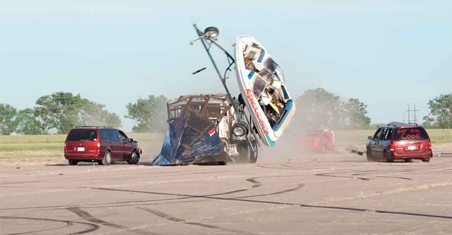 Redneck science. Por suerte para Champlin el camión aguantó y Buttercup estaba listo. Así que tocaba demostrar su capacidad devastadora. Él y su equipo se lo llevaron a una pista de aterrizaje de la Segunda Guerra Mundial, donde colocaron obstáculos a la altura: coches (apilados o haciendo barrera de múltiples formas), un remolque con un barco, varias caravanas, barriles o un castillo hinchable.
