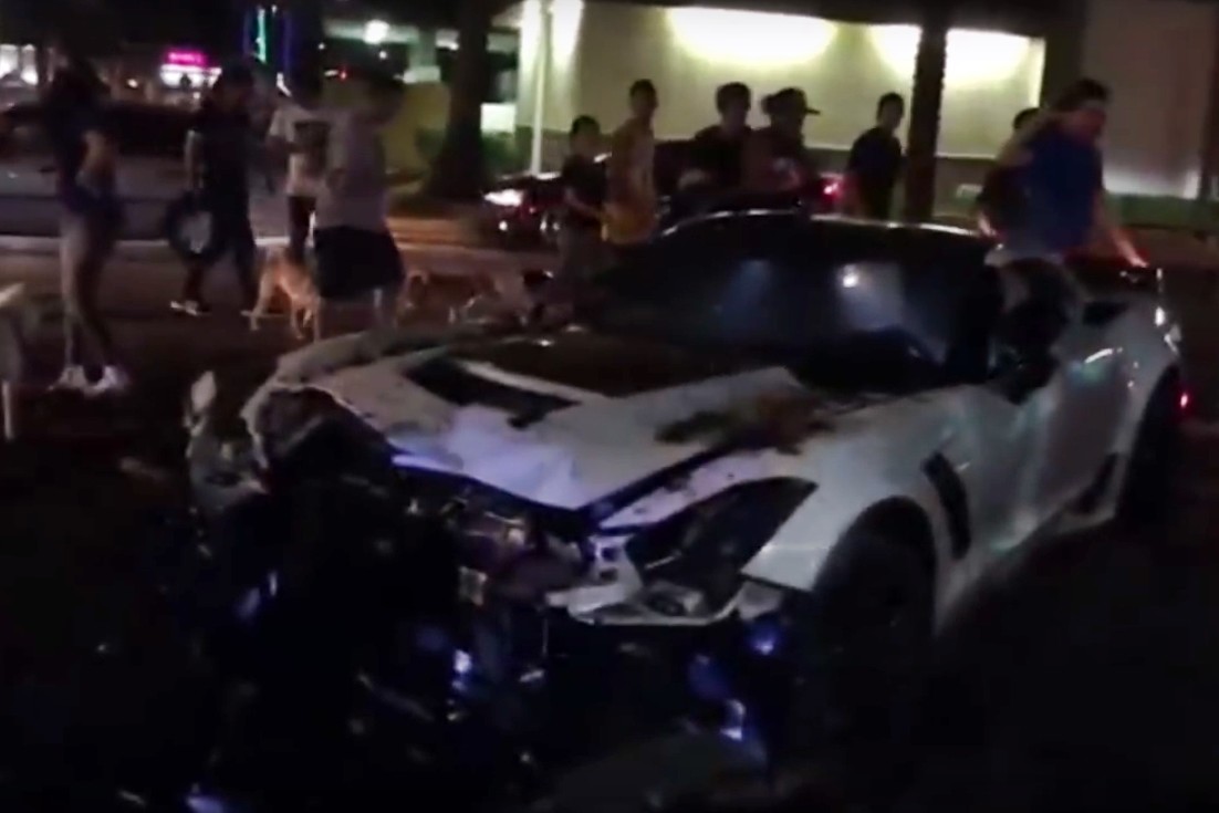 Apuntan a que el conductor era joven y se vino arriba. Para darse un baño de multitudes realizó un burnout considerable, bastante bien ejecutado, y salió a fuego. Engranó segunda, volvió a acelerar a fondo y el deportivo americano (supongo que con las ayudas desconectadas) perdió tracción en las ruedas traseras. El resto os lo podéis imaginar: pocas manos, un coche que circula demasiado rápido y una palmera.