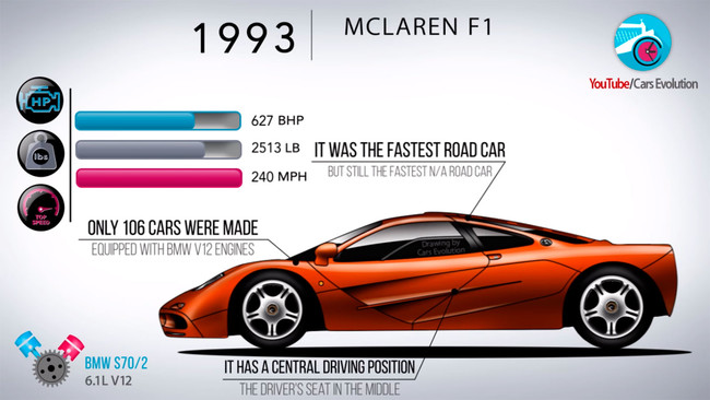 Pasarían 23 años hasta que el primer McLaren de producción viera la luz. Se trata del icónico McLaren F1 que no necesita presentación. Limitado a 106 unidades, esta bestia fue hasta 2007 el coche más rápido sobre la faz de la tierra, con una marca de 391 km/h. Su motor V12 desarrollado por BMW rendía 635 CV para un poco menos de 1.140 kilos. Pese al P1, McLaren no ha conseguido crear un verdadero sucesor del F1, quizá lo logre con el proyecto BP23.