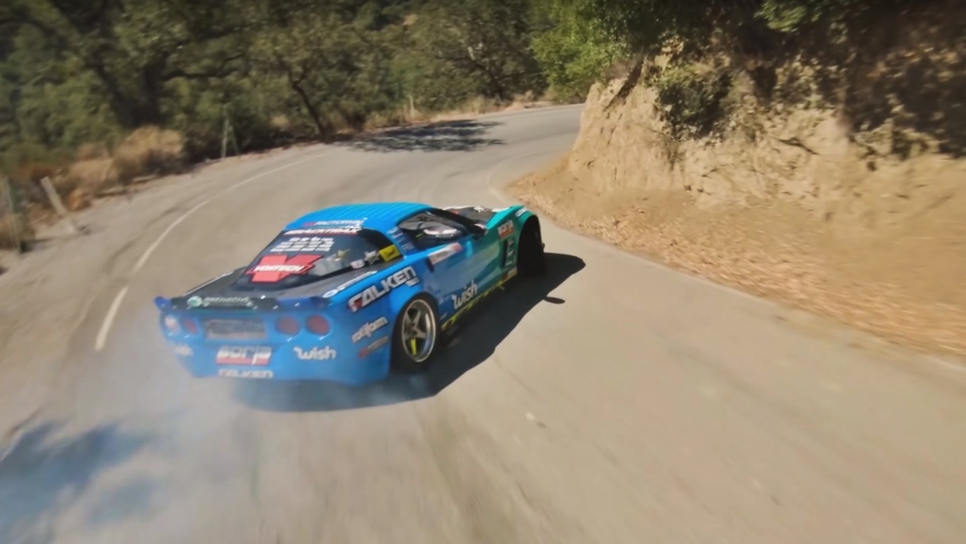 La cámara metida en plena nube de humo, la agresividad del piloto para rodar a ese ritmo en una carretera realmente estrecha y el bramido del motor del Corvette destrozando los neumáticos generan un clima de tensión cuyo clímax llega al hacer una curva rozando el quitamiedos.