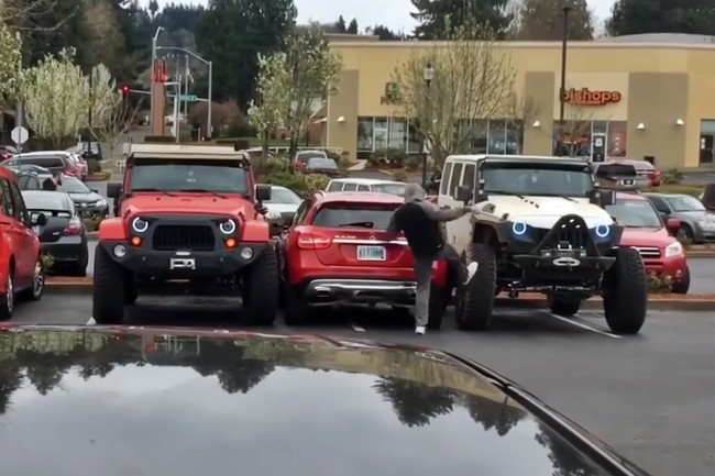 Cansados de la ausencia de empatía y educación, los propietarios de estos dos Jeep Wrangler modificados y con cara de pocos amigos han decidido tomar cartas en el asunto y erigirse como una especie de supervengadores del asfalto (a tiempo parcial, que luego tienen que hacerse sus rutitas offroad, suponemos). La víctima ha sido un Mercedes-Benz GLA aparcado justo en el medio de dos plazas, ocupando ambas porque yo lo valgo.