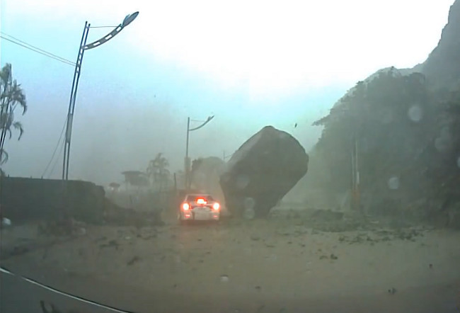 De repente de la ladera de la montaña sale impulsada por el agua una lluvia de piedras que golpean al coche blanco que circula delante del coche que graba. Las gotas y el barro tapan lo peor del corrimiento, una enorme roca aparece rodando de la nada y se inclina sobre el coche recién golpeado por las piedras más pequeñas. Y afortunadamente su contorno con aristas hace que no llegue a vencerse sobre el coche, rebotando y quedándose en medio de la carretera, sin tocar al coche.