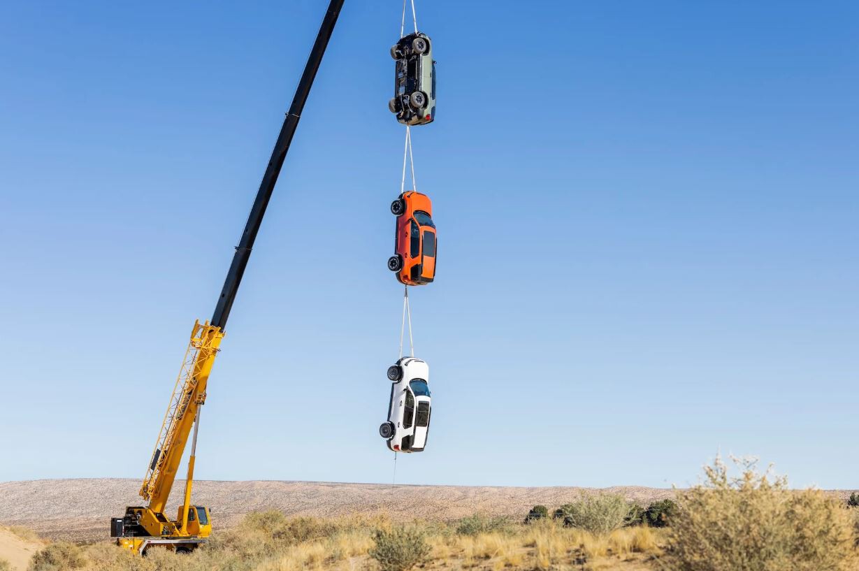 Tres coches colgados de una grúa para demostrar su resistencia extrema