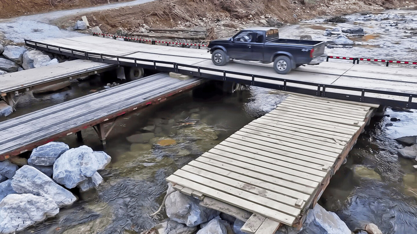 Aaron Rigsby, cazador de tormentas, grabó con un dron la infraestructura provisional y la publicó en su canal de YouTube. En el vídeo se ven los tres remolques de plataforma colocados en paralelo al arroyo. Y aunque probablemente no sería prudente cruzar con un camión cargado, parece bastante estable para que los coches y pickups puedan cruzarlo.