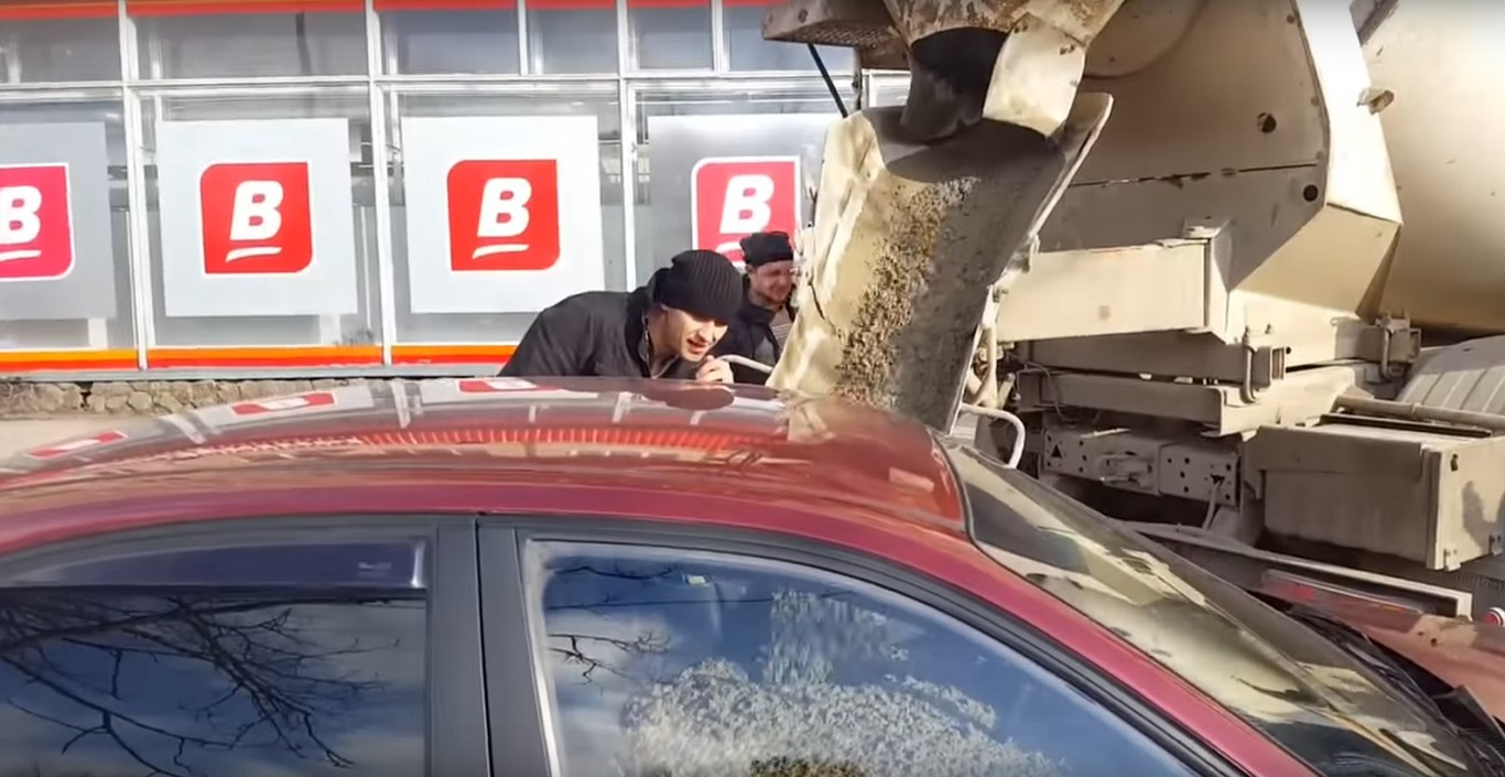 Cuando el susodicho se enteró de la broma, decidió transformar toda su ira en ingenio y preparó la venganza en un plato muy frío y con forma de hormigonera. Alquiló una, y en medio de un aparcamiento rodeado de curiosos, llenó el coche de la señora Leal de hormigón.