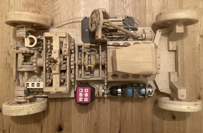 Tener el conocimiento y la habilidad para construir elementos mecánicos como una caja de cambios con materiales como el cartón o incluso vehículos capaces de salvar obstáculos con piezas de LEGO ya tiene mucho mérito, pero hacer un coche de madera a escala con motor V8 desde cero, y que funcione, ya es pasarse el juego.