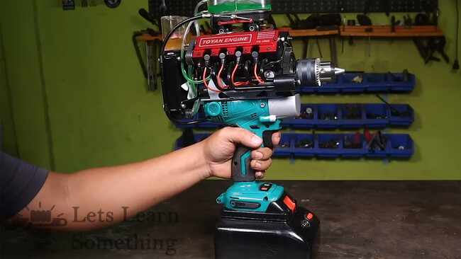 En un vídeo de poco más de 13 minutos muestran cómo han acoplado a un viejo taladro de batería un motor Toyan V8 que se puede comprar listo para funcionar. En realidad es un motor V8 de 28 centímetros cúbicos que está diseñado para dar vida a coches de radiocontrol, pero ya vemos que puede tener otras utilidades.