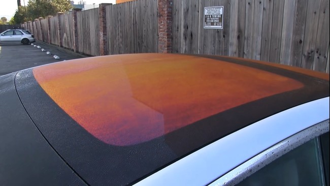 Este tratamiento es el culpable de que los techos se vean naranjas, y también del agua. ¿Pero cómo es posible que se vea naranja si el techo es negro? Ahora que el frío empieza a aparecer en el hemisferio norte la humedad se deposita en los coches por la noche, creando pequeñas gotas de agua.