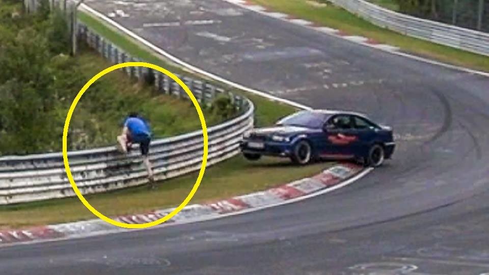 Sin dudarlo un segundo, se fue hacia la curva por dentro del guardarraíl para avisar mediante aspavientos con las manos al resto de coches que venían. Como los guardarraíles del Nordschleife son muy altos, muchos no le veían, así que decidió saltar a la pista para avisarles con más claridad. Esto casi le cuesta la vida porque un M3 E46 que se acercaba, al accionar los frenos perdió el control, se fue hacia el interior de la curva y a punto estuvo de arrollarle.