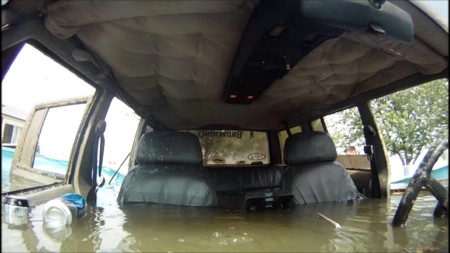 A estas alturas del año el agua en Ontario tiene que estar de lo más apetecible para darse un chapuzón, pero no de esta manera, a bordo de un Jeep y sin cerrar siquiera las ventanas. Aparte del destrozo, habrá que ver cómo se recupera el coche, que aunque sea un todoterreno no se trata precisamente del DeLorean anfibio. Por cierto, si esa que vemos ahí es la calidad que da una GoPro Hero3... vaya, que he visto neones de motel peliculero con menos destellos por minuto.