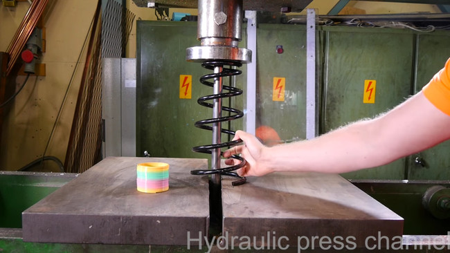 Podemos pensar que este robusto elemento del sistema de suspensión de un coche es lo suficientemente grueso como para soportar casi cualquier cosa. Ah, pero si hablamos de unos individuos capaces de pasar por la prensa hidráulica una prensa hidráulica (sí, algo así han llegado a perpetrar), ya podemos imaginar que el muelle no saldrá demasiado bien parado.