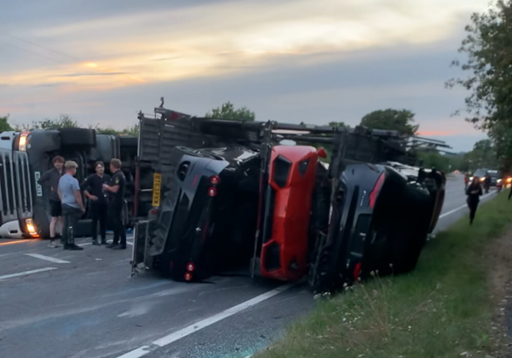 Este vídeo duele sólo con verlo: un camión que transportaba una decena de flamantes superdeportivos y coches de altos vuelos acabó volcado y con tremendas joyas sobre ruedas como víctimas.