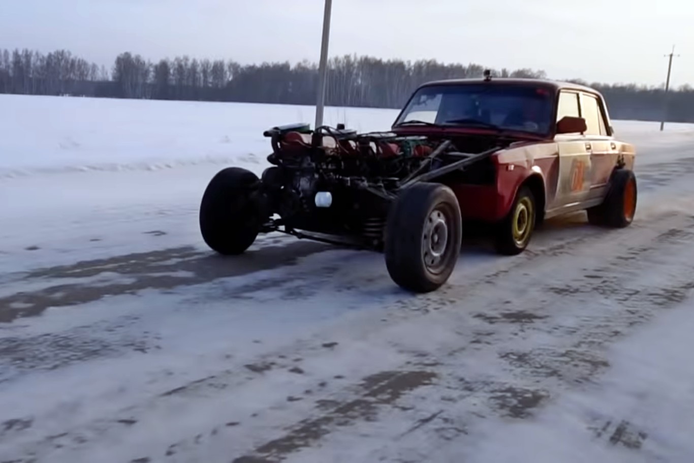 Una nueva extensión del chasis hacia delante, añadir un segundo tren delantero direccional y, de nuevo, acoplar cigüeñales. Un Lada de 12 cilindros en línea, operativo y con ganas de acelerar cuya potencia se eleva hasta los 152 CV a las ruedas traseras. Detrás, por cierto, también ha habido modificaciones, colocando ruedas gemelas en cada extremo para mejorar la tracción sobre nieve.