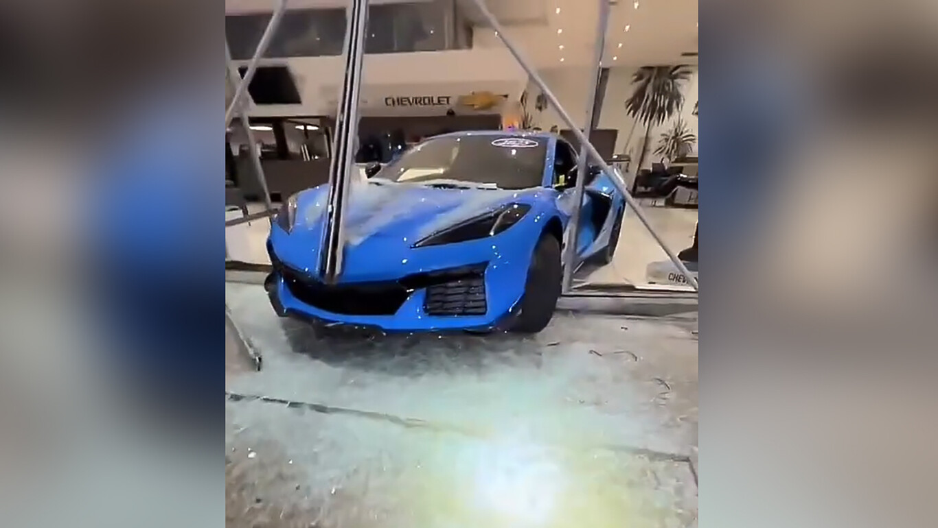 Utilizó el patinete para romper la puerta de cristal del concesionario, y así accedió al interior. Allí encontró las llaves del Corvette Z06, aunque no se detalla si estaban puestas o dio con ellas en otro lugar de las instalaciones. Sea como fuere, tenía las llaves y solo quedaba sacar el coche de allí.