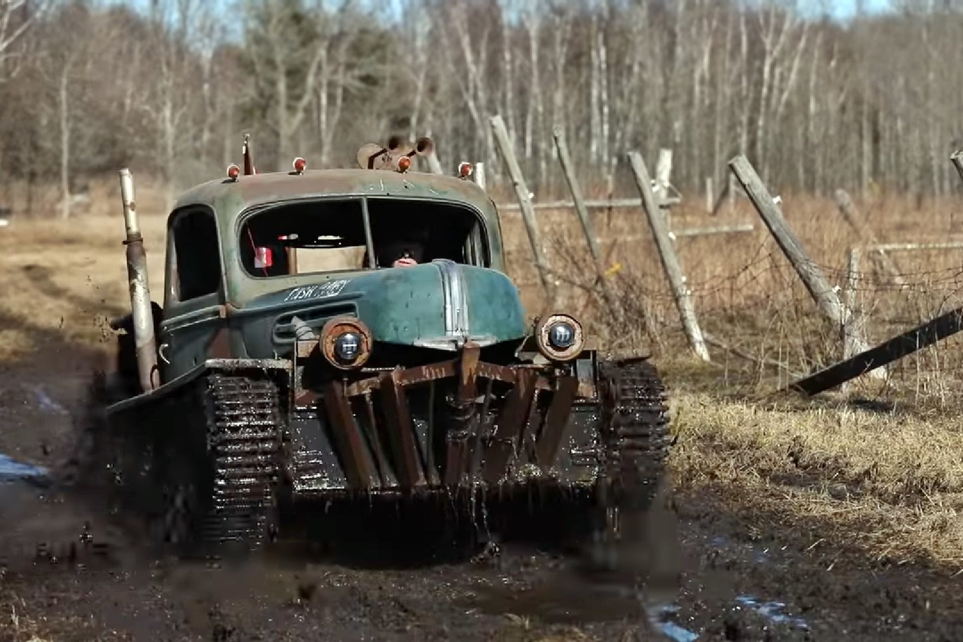 Durante los últimos cinco o seis años Cormier se ha pasado el tiempo dando forma a lo que su mente le iba sugiriendo. Partió del chasis de un vehículo oruga de 1944 utilizado en la Segunda Guerra Mundial al que añadió un motor small block V8 350 Chevrolet turboalimentado y una transmisión del mismo fabricante. El remate siniestro lo pone una carrocería cortada (y tiroteada) de grúa Mercury de 1947.
