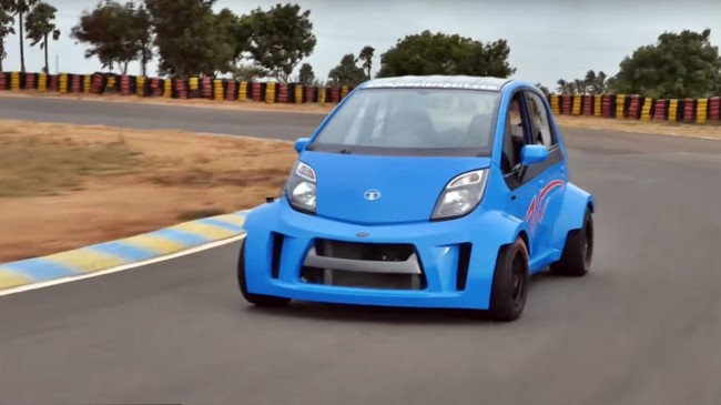 Entre las muchas carencias del vehículo indio no podríamos criticar un mal comportamiento deportivo, no estaba pensado para ello al fin y al cabo. Así que viendo el lado positivo de las cosas JA Motorsport decidió volver al Tata Nano un coche de circuito con chasis tubular y un motor tetracilíndrico de 1.300 cc de motocicleta que supera los 200 caballos.