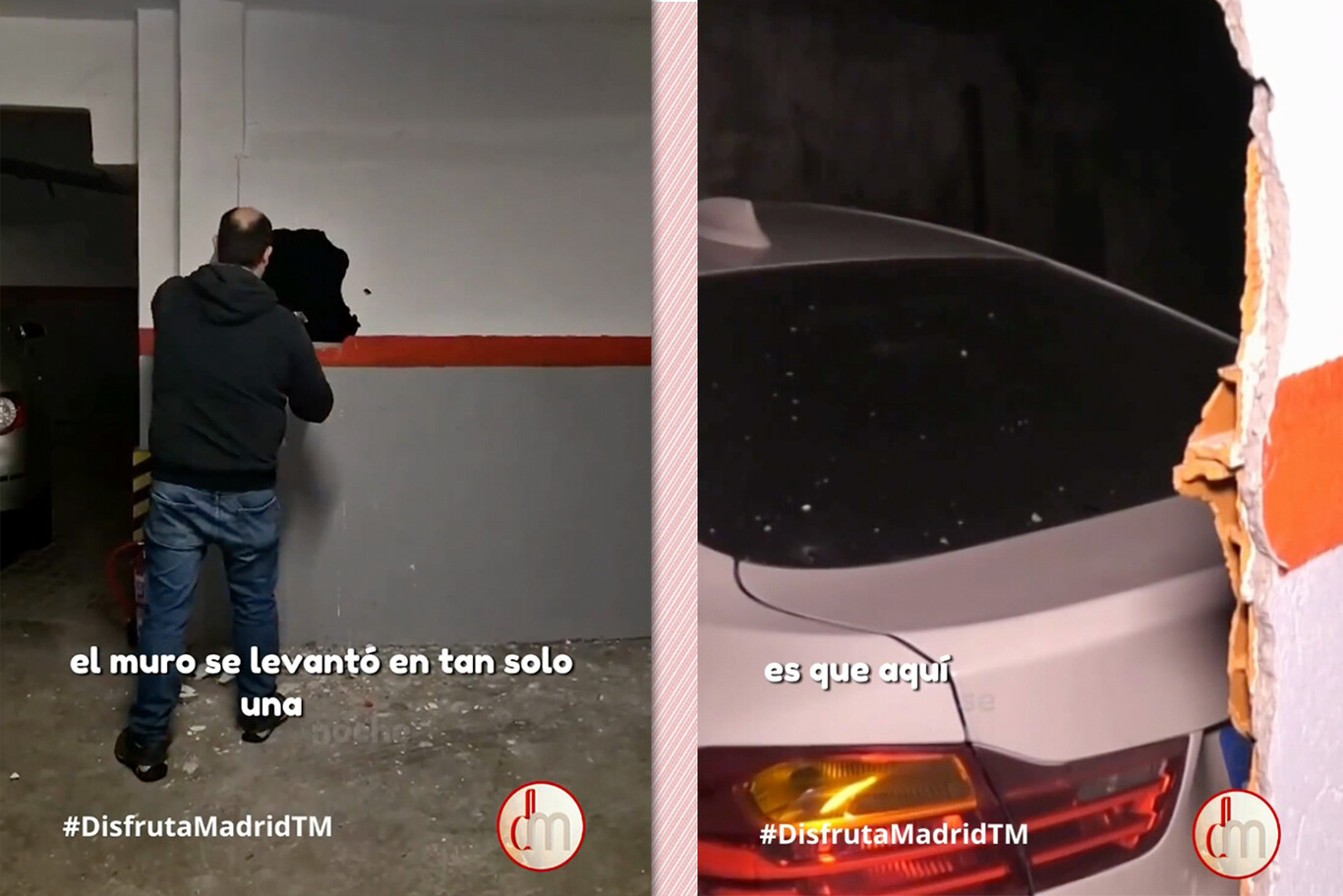 Según cuenta Gran Madrid, este vecino, que se llama Fernando, asegura que “levantaron el muro en una sola noche” y explica que dejó el coche ligeramente fuera de la línea que delimita su plaza para que no se lo volvieran a emparedar, pero que no sirvió de nada porque lo hicieron abombado para salvar la parte trasera de su BMW.