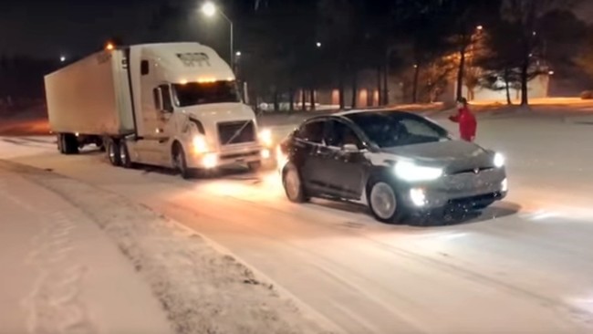 Ben Spreen, empleado de Tesla, estaba conduciendo por las carreteras de Raleigh (Carolina del Norte) cuando se topó con un camión del servicio postal de 40 toneladas incapaz de ascender por una pendiente. La falta de agarre hacía imposible que el enorme Volvo encontrase la tracción suficiente para tirar de su carga cuestarriba. Por suerte Ben y su Tesla estaban allí.