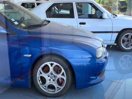 Lo primero que atrapa la vista es un Alfa Romeo 156 GTA azul, protagonista absoluto del escaparate. Equipado con el mítico motor Busso V6 de 3.2 litros, es uno de los modelos más deseados por los entusiastas de la marca. Según pudo saber después el YouTuber, este coche no era propiedad del concesionario: pertenecía a un cliente que jamás volvió a recogerlo.