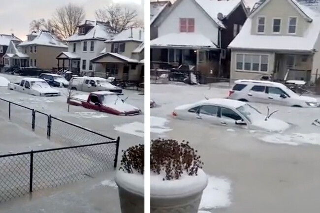 El barrio se inundó durante la noche, con el agua alcanzando casi medio metro de altura, y a los pocos minutos el agua se congeló, sellando los coches, las puertas de las casas y el mobiliario urbano en un inmenso bloque de hielo. Es ‘El Día del Mañana’ hecho realidad.