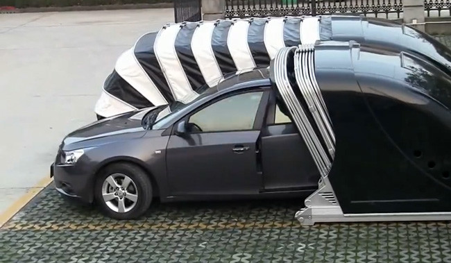 Tener un garaje propio es el sueño de todo amante de los automóviles, aunque no todos pueden permitírselo. Quizá por eso, en China han inventado una especie de plaza de aparcamiento plegable, que no es más que una cúpula que cubre el coche. No es precisamente un garaje al uso, ya que ni siquiera cabes tú dentro, pero desde luego proteges el coche de las inclemencias del tiempo.